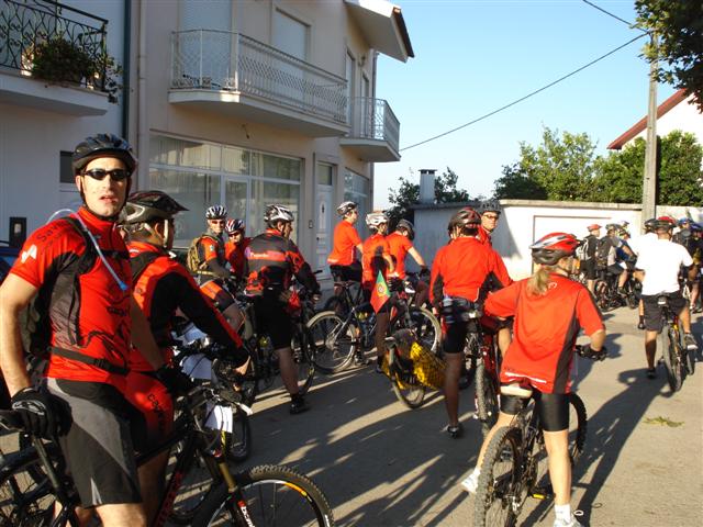 Hoje fomos até à Moita participar na Rota do Leitão, evento no qual mais uma vez fizémos o Convívio anual Cagaréus,Angarnas e amigos.Chegados à Moita onde encontámos o pessoal do Angarna,lá fomos até à zona de partida onde nos situamos na cauda do pelotão pois o ritmo de andamento iria ser elevadíssimo.O Fred que teve um ligeiro atraso e que trazia a nossa amiga no Extrawheel que por sinal teimava em não se segurar, partiu mais tarde mas o pessoal esperou por ele já no trilho.Depois de hidratar-mos com as minis que o Hernâni levou nos sacos do Extraweheel,seguimos viagem sempre a um ritmo alucinante.Pelo caminho o Gansax decidiu consolar a menina,fazendo um 69 em plena estrada :)